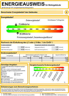 Auf der ersten Seite des Energieausweises werden die Gebäudedaten gelistet, auf der zweiten Seite wird der Energiebedarf mit üblichen Bauweisen verglichen.