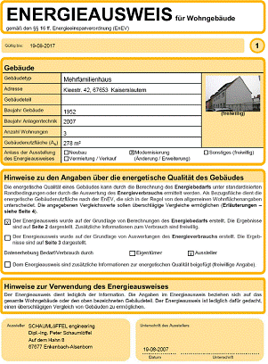 Der Gebäudeenergieausweis wird mit der EnEV 2007 zum 01.01.2008 eingeführt. Ab diesem Zeitpunkt ist für alle Neubauten ein Energiebedarfsausweis auf der Basis technischer Gebäudedaten zu erstellen.
